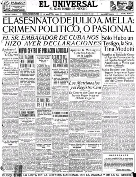 En la esquina de las calles Morelos y Abraham González, la pareja dobla hacia esta última. Falta poco para las diez de la noche. Justo frente a la panadería, a solo unos pasos del número 31 —su hogar—, los detiene el sonido de dos disparos casi simultáneos —después, Tina recordaría que incluso sintió el olor a pólvora—. Antes que ella pueda reaccionar, Mella suelta su brazo y corre a la acera opuesta. La joven exclama: «¡Julio, Julio!», y va tras él. Cree percibir una sombra humana moviéndose a su espalda, pero concentra toda la atención en el hombre amado a punto de desplomarse. Cuando llega a su lado, ya está en el suelo. Apoya la cabeza de él en su regazo, y pide ayuda a gritos: un automóvil para llevarlo al hospital. Mientras se juntan los primeros curiosos, ella escucha al cubano responsabilizar del crimen a Machado, a Magriñá, a la embajada de la isla en México. Otras personas también lo oyen. Julio dice: «Muero por la Revolución» y, luego de instantes que parecen eternos, lo introducen en un auto rumbo al centro médico.